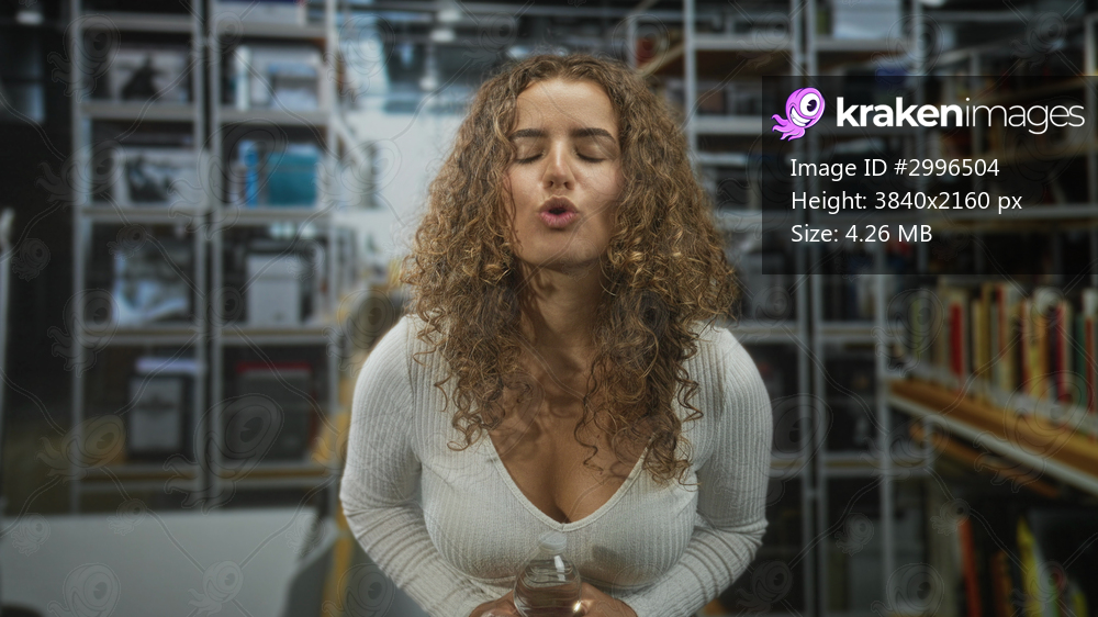 Young woman with curly hair holding plastic water bottle, puckers lips while standing in a library archive aisle between shelves; playful curiosity.