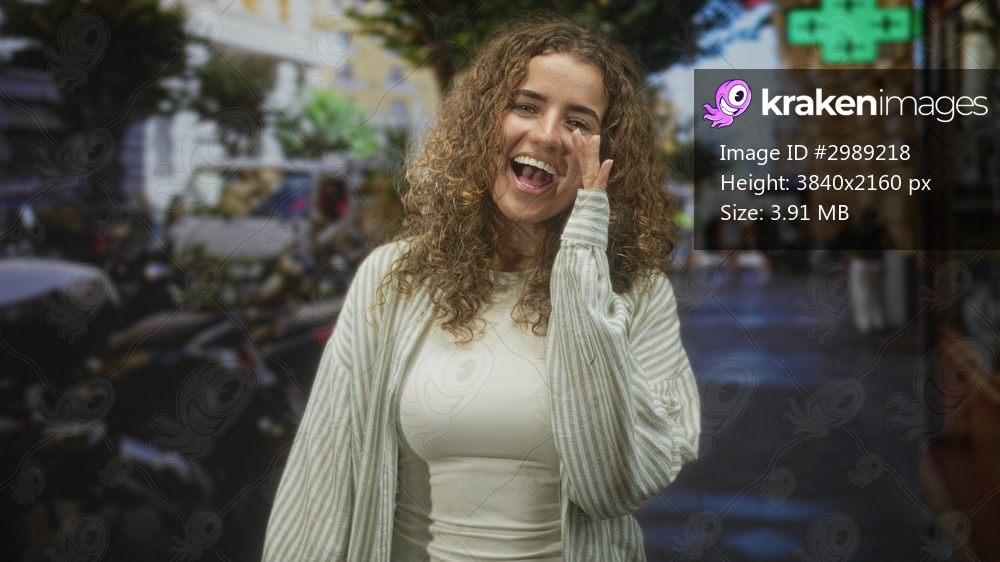 Young woman with curly hair holds hand to face laughing on a busy city street lined with scooters and shops, pharmacy cross visible; joy warmth spontaneity. - Kraken Images
