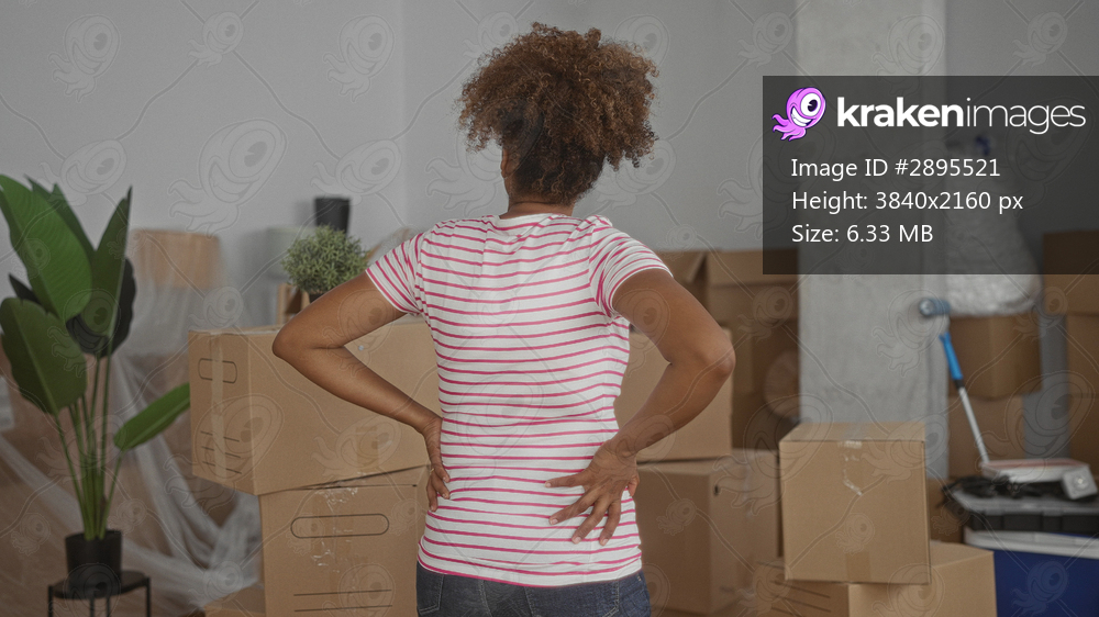Young woman with curly hair holds lower back amid stacked moving boxes in house as she surveys packed rooms; fatigue backache relocation.