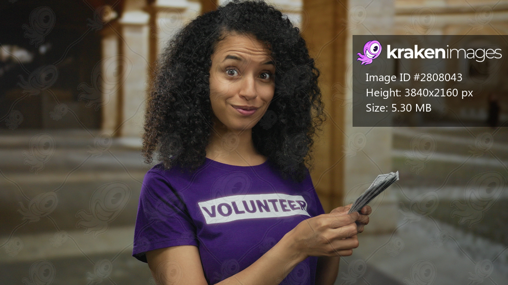 Young woman with curly hair in purple volunteer shirt holds us dollars standing on outdoor street in old town setting smiling confidently.