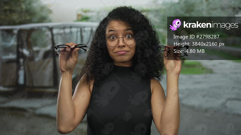 Young woman with curly hair outdoors holding two pairs of glasses in each hand looking curious and contemplative in a green park setting