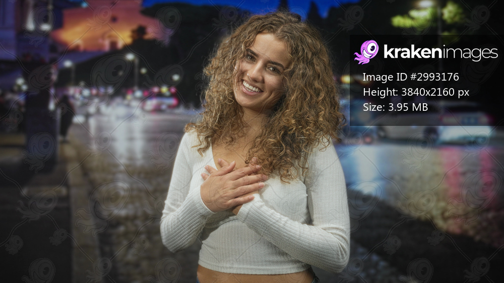 Young woman with curly hair places hands on chest in wet city street at night, smiling and looking upward; gratitude warmth hope.