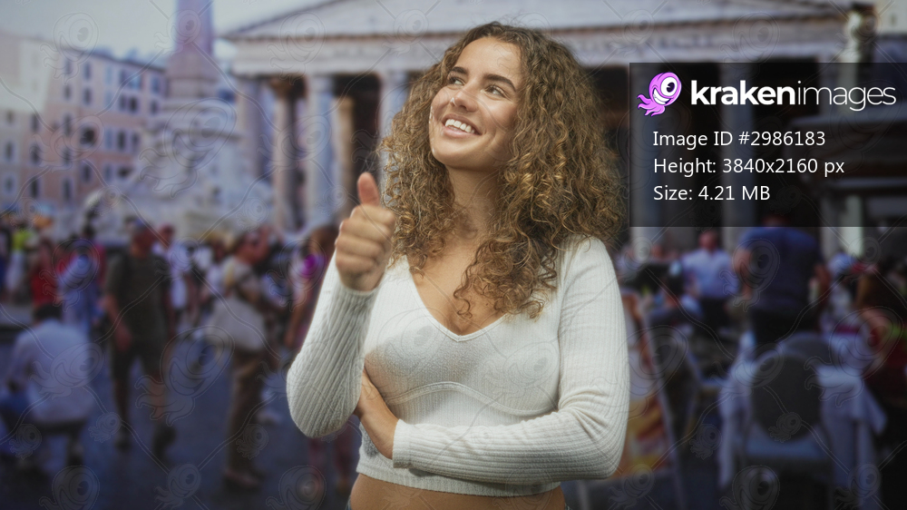 Young woman with curly hair shows thumbs up and bare midriff in front of a historic building and busy square; confidence travel.