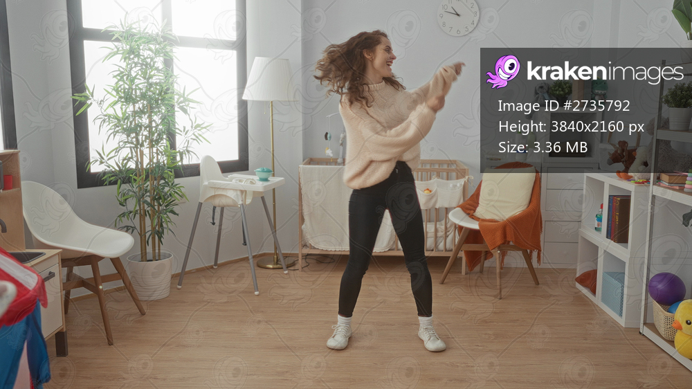 Young woman dancing joyfully in a well-decorated baby room with a crib and toys, creating a lively and cheerful atmosphere under soft natural light.