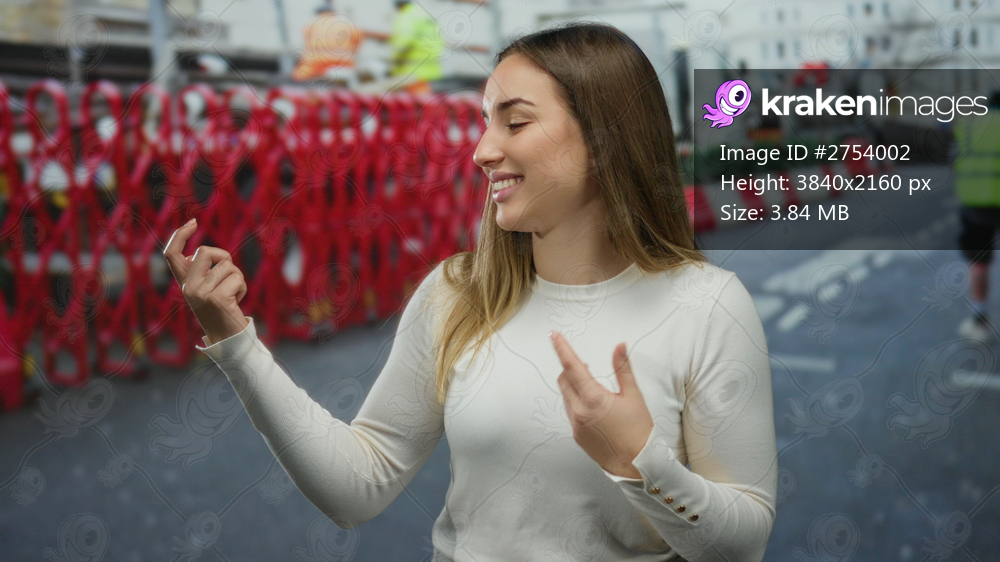 Young woman dancing joyfully on busy city street with vibrant red construction barriers and blurred workers in the background, showcasing urban outdoor happiness and movement. - Kraken Images