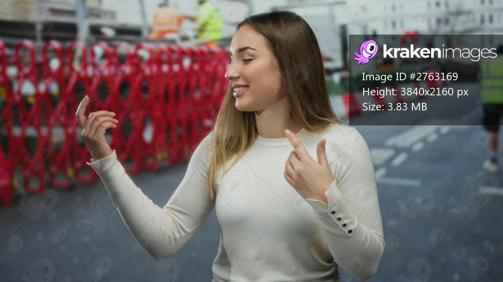 Young woman dancing joyfully on busy city street with vibrant red construction barriers and blurred workers in the background, showcasing urban outdoor happiness and movement. - Kraken Images