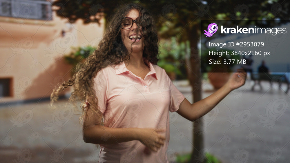 Young woman dancing and playing air guitar with hands and smiling on a coastal street promenade; playful joy music carefree.