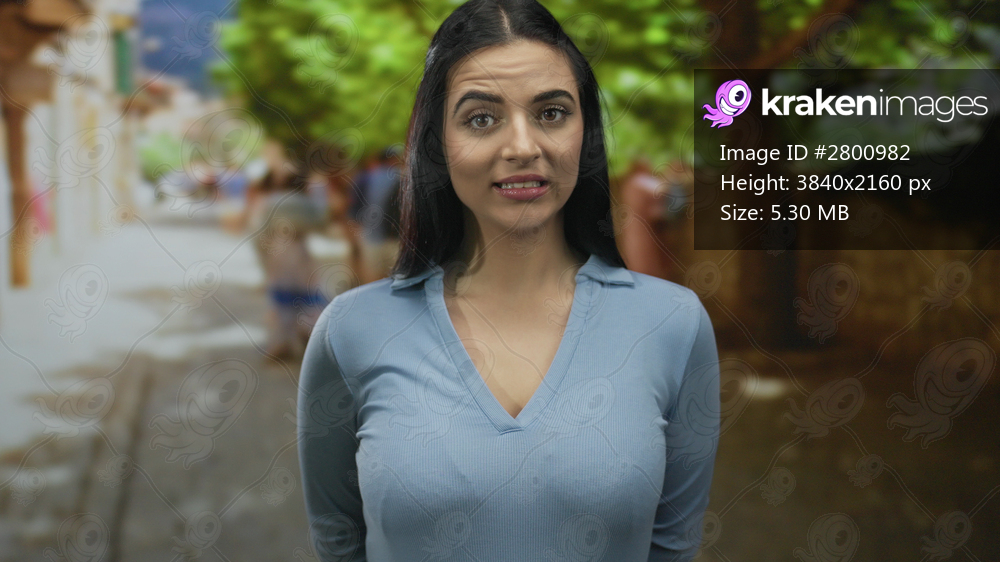 Young woman with dark hair and blue shirt standing outdoors on a sunny day in a vibrant street background, expressing emotion.