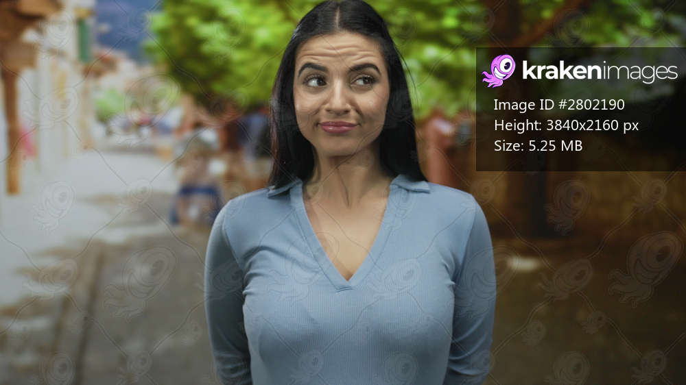 Young woman with dark hair and blue shirt standing outdoors on a sunny day in a vibrant street background, expressing emotion.
