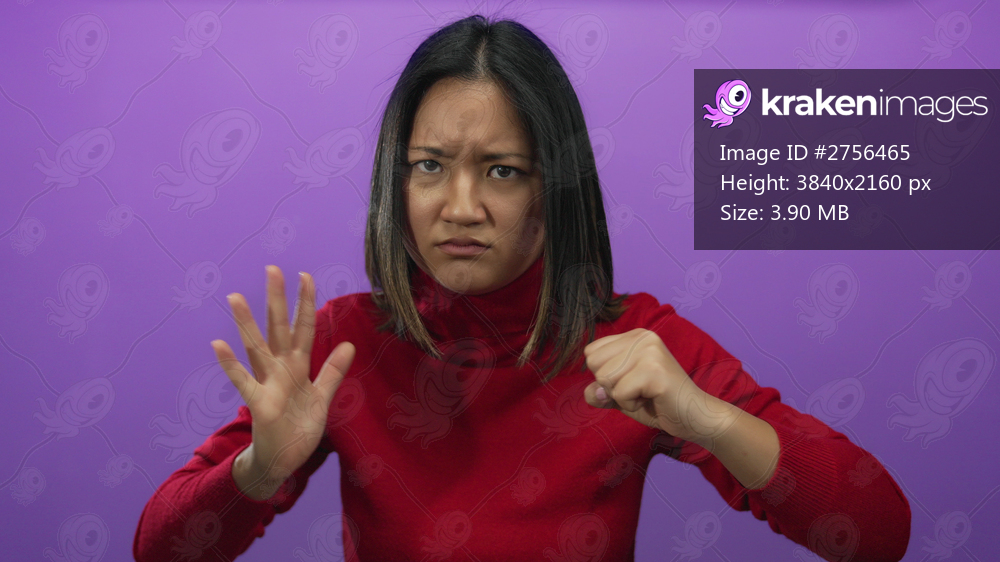 Young woman demonstrating determination with fist in hand against vibrant purple background wearing a red sweater emphasizing strong emotions and focused expression - Kraken Images