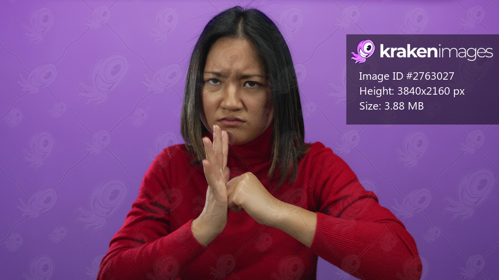 Young woman demonstrating determination with fist in hand against vibrant purple background wearing a red sweater emphasizing strong emotions and focused expression - Kraken Images