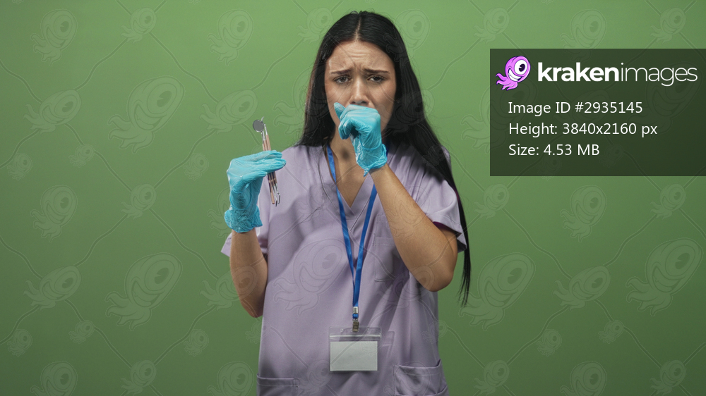 Young woman dentist holding dental mirror, gloved hand to mouth in studio, hand on cheek toothache; concern urgency.