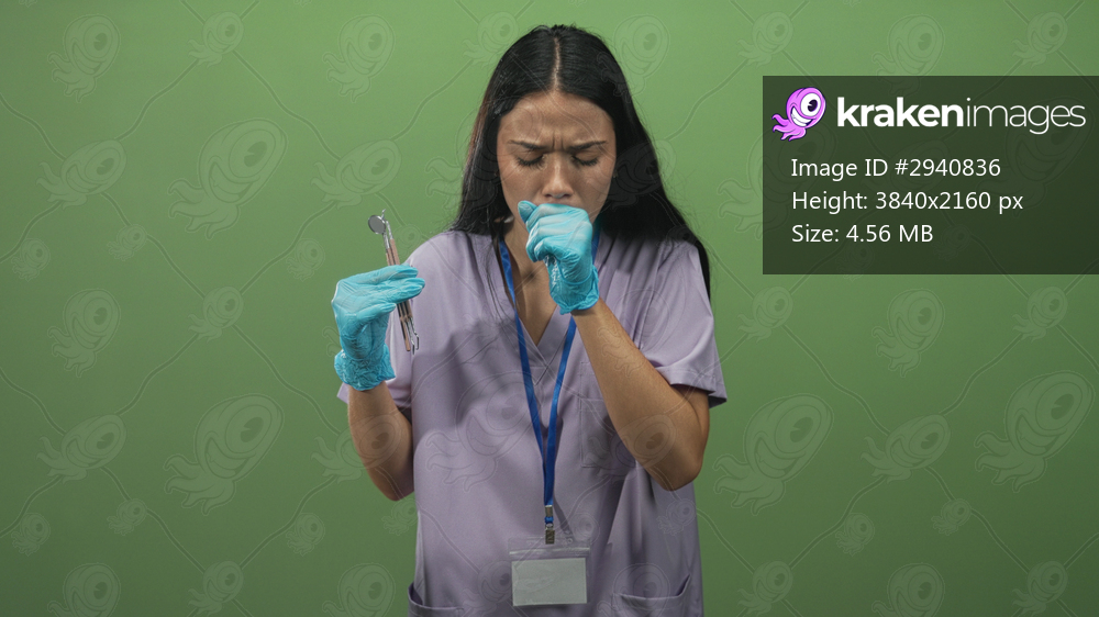 Young woman dentist holding dental mirror, gloved hand to mouth in studio, hand on cheek toothache; concern urgency.