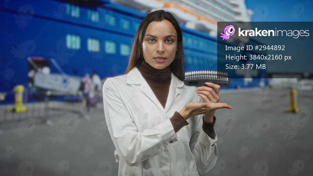 Young woman dentist holds dental shade guide and inspects tooth sample at port street near dock while wearing lab coat; clinical concentration.