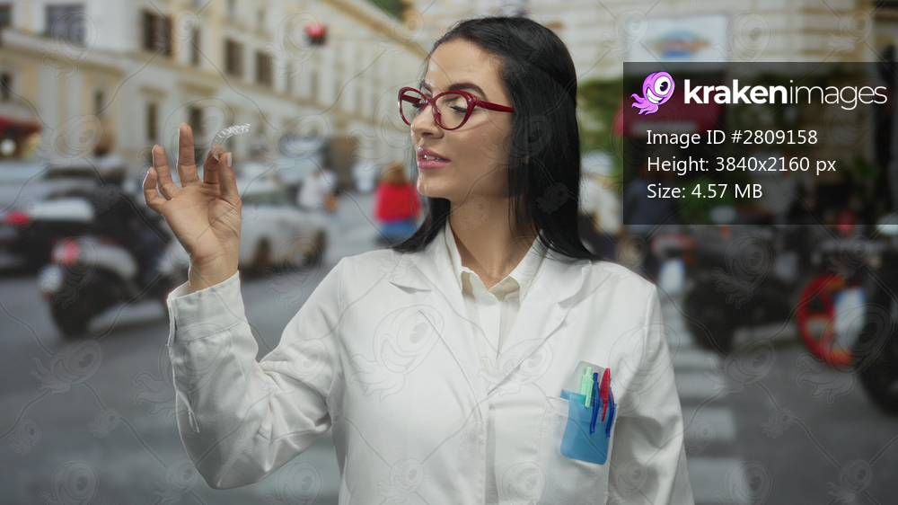 Young woman dentist in uniform holds invisible braces on a busy street showcasing modern dental care outdoors.