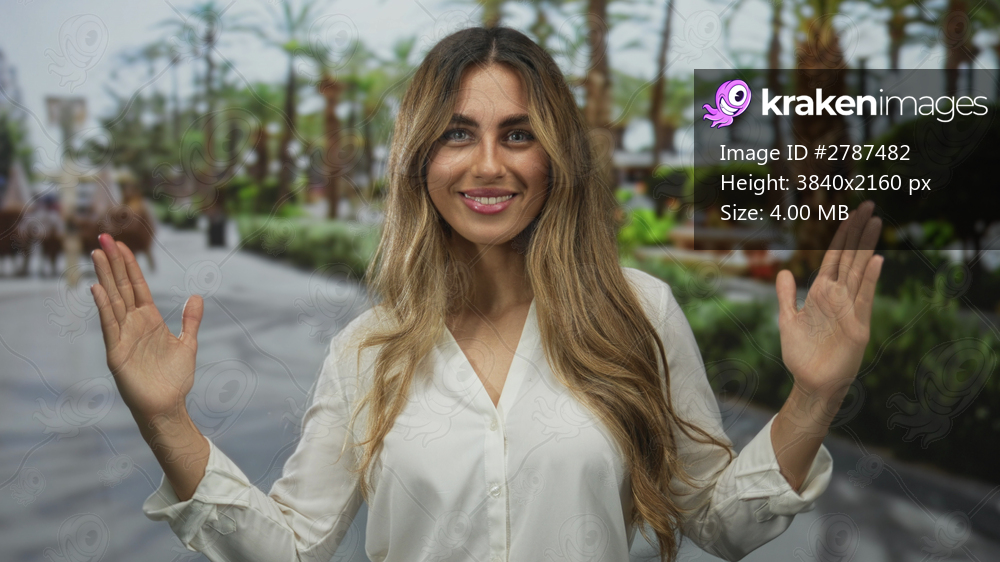 Young woman displays size gesture with open hands on a palm lined promenade; measurement scale comparison dimension.