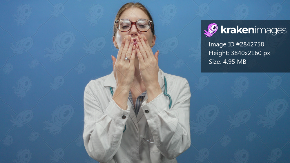 Young woman doctor blows kiss with stethoscope and bare lips in studio; trust healing compassion care.