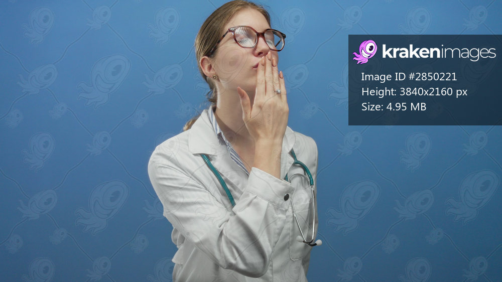 Young woman doctor blows kiss with stethoscope and bare lips in studio; trust healing compassion care.