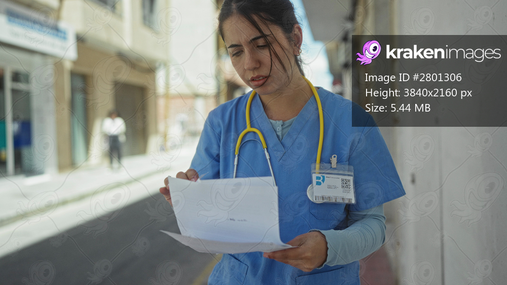 Young woman doctor checking documents outdoors on a street wearing a medical uniform with a stethoscope showing focused working expression in a busy urban environment - Kraken Images