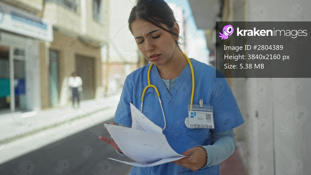 Young woman doctor checking documents outdoors on a street wearing a medical uniform with a stethoscope showing focused working expression in a busy urban environment - Kraken Images