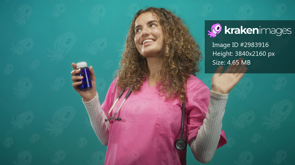 Young woman doctor with curly hair in pink scrubs holding blue pill bottle with stethoscope and waves hand in studio; care wellness cheerful.