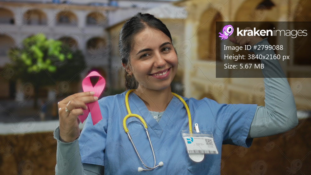Young woman doctor holding a pink ribbon and flexing her arm muscle on a street while smiling in daylight; empowerment solidarity.