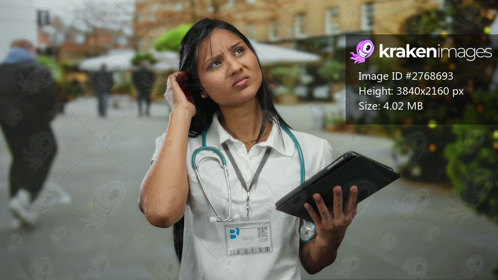 Young woman doctor holding tablet with stethoscope and badge on busy street outdoor pondering possible medical solutions