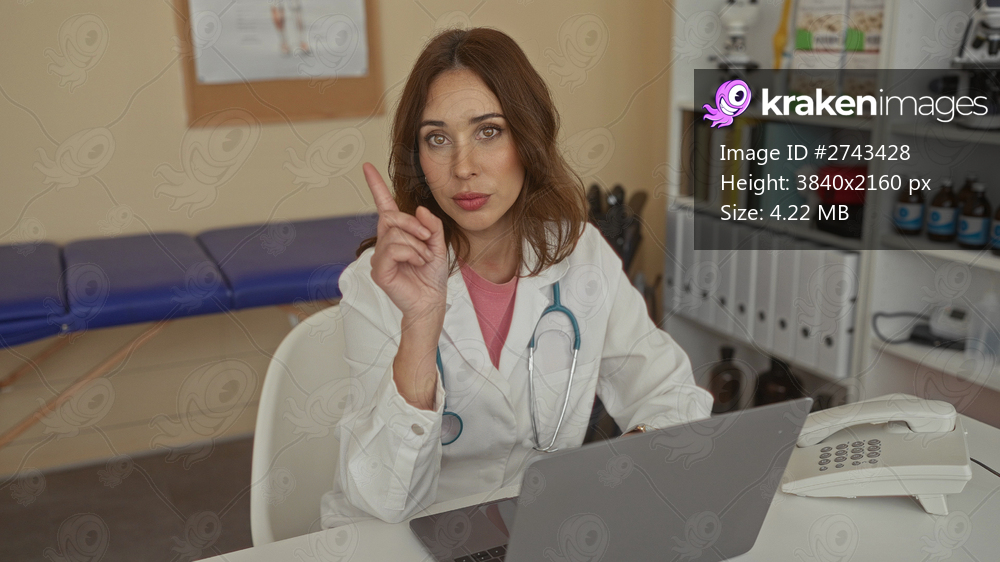Young woman doctor in a white coat with a stethoscope works on a laptop in a clinical interior surrounded by medical equipment and files, indicating a healthcare setting. - Kraken Images