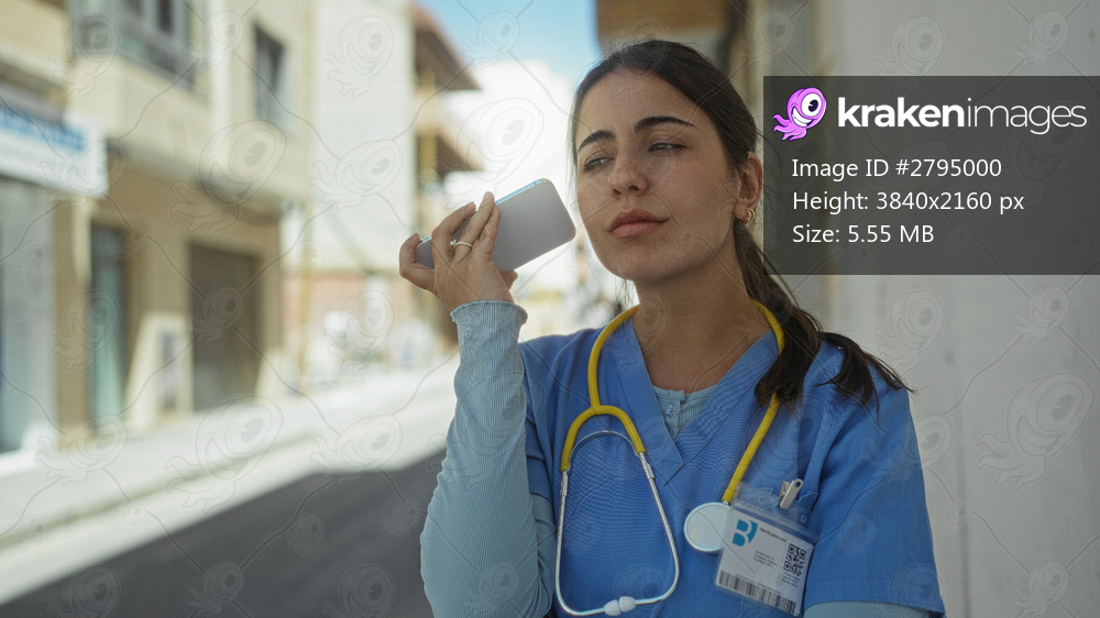Young woman doctor in blue scrubs holds smartphone to her ear on a sunny street with buildings behind her; empathy understanding compassion.