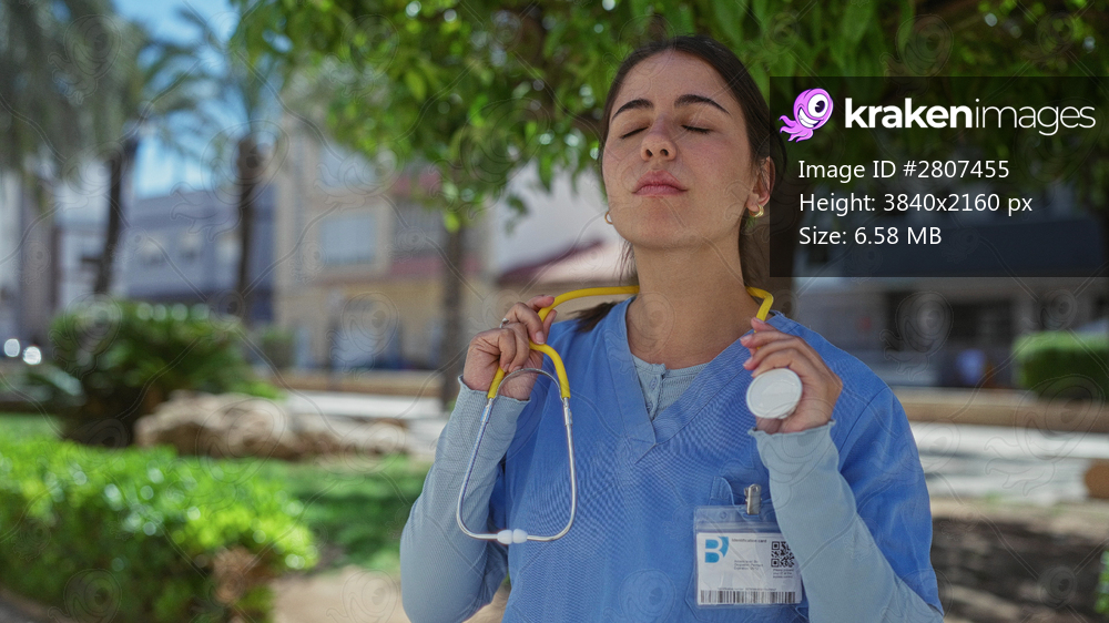 Young woman doctor in blue uniform with stethoscope relaxing outdoors in a sunny park setting, surrounded by lush greenery and urban buildings.