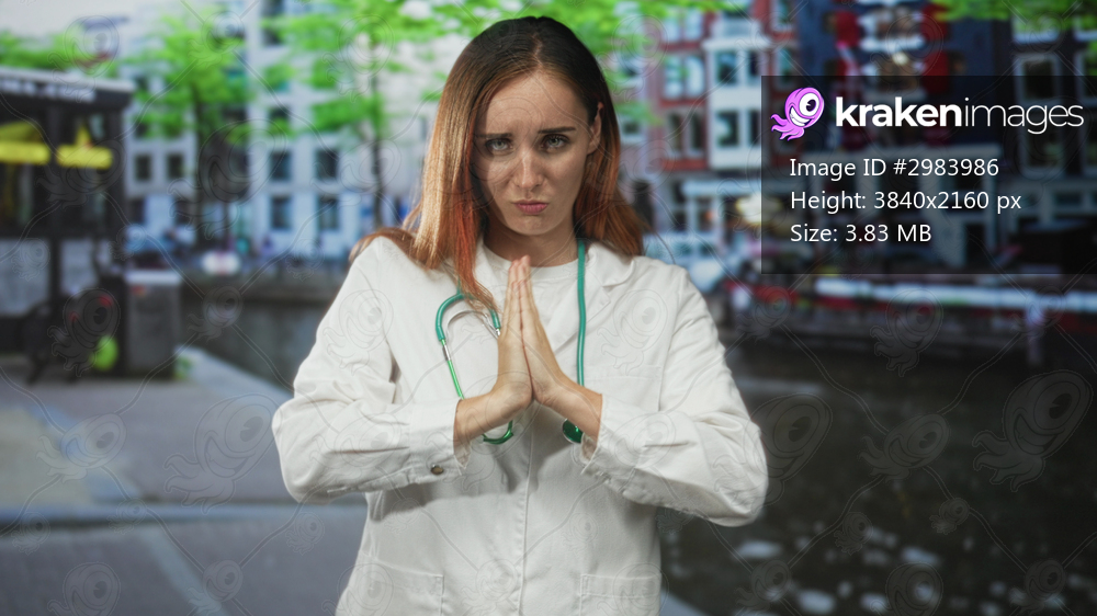 Young woman doctor in lab coat with stethoscope presses hands in prayer gesture in a studio with canal backdrop; pleading concern.