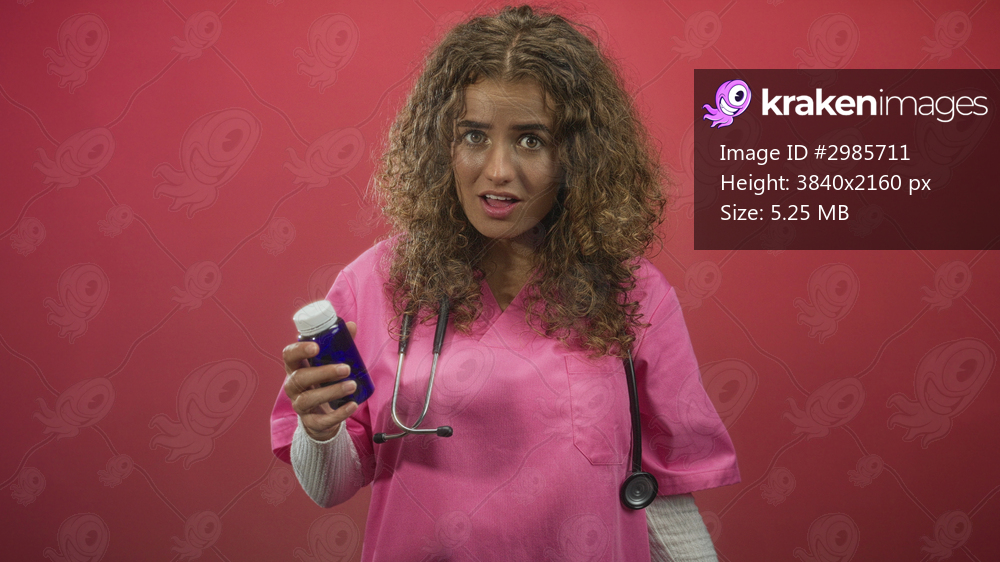 Young woman doctor in pink scrubs holding a blue pill bottle and looking confused with open mouth and stethoscope visible in studio; concern.