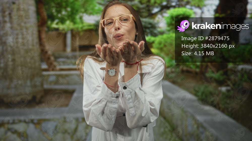 Young woman doctor in white coat with stethoscope blows kiss hands to mouth on forest park walkway; care support affection.