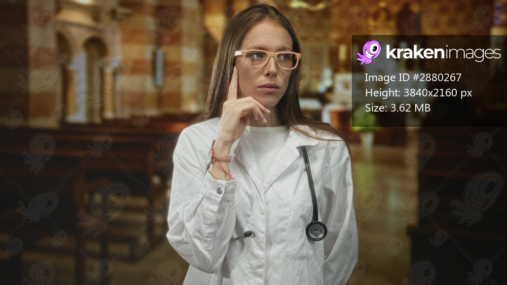 Young woman doctor in white coat with stethoscope, hand on chin gesture standing inside a church building with pews and altar visible; contemplation.
