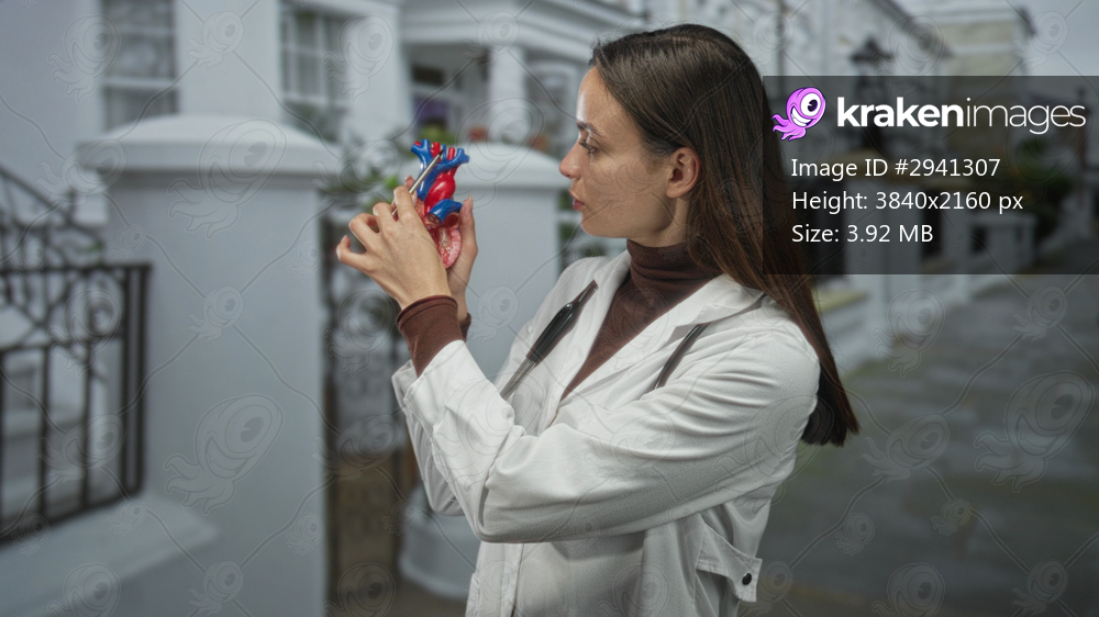 Young woman doctor in white coat with stethoscope holds anatomical heart model and points probe with hands on street; medical education curiosity.