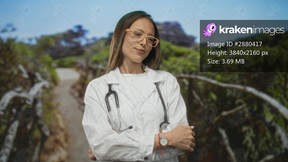 Young woman doctor in white labcoat with stethoscope and glasses, arms crossed on a forest path with greenery and railing; confidence wellness care.