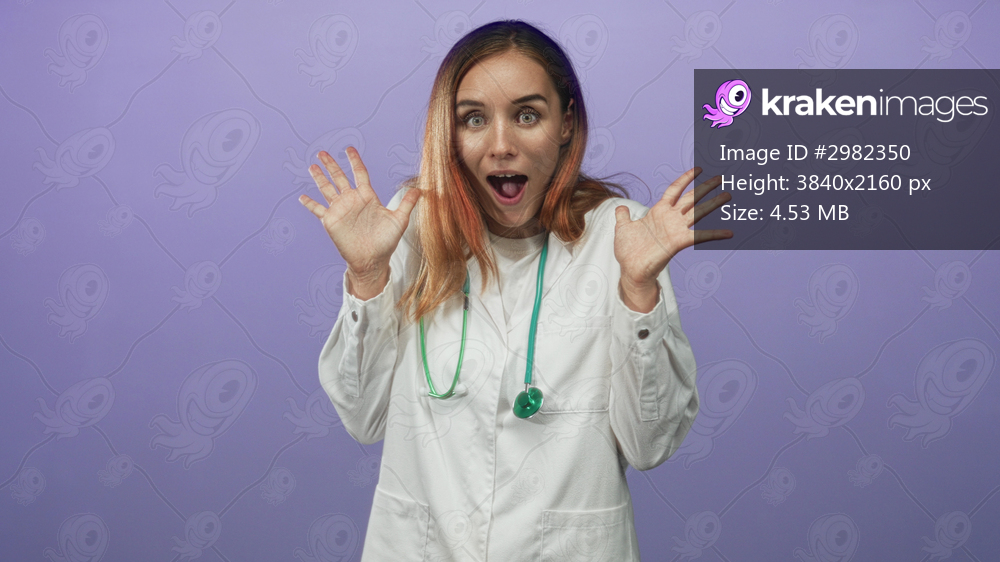 Young woman doctor in white labcoat with stethoscope, hands raised and open mouth showing surprise in studio; surprise playfulness.