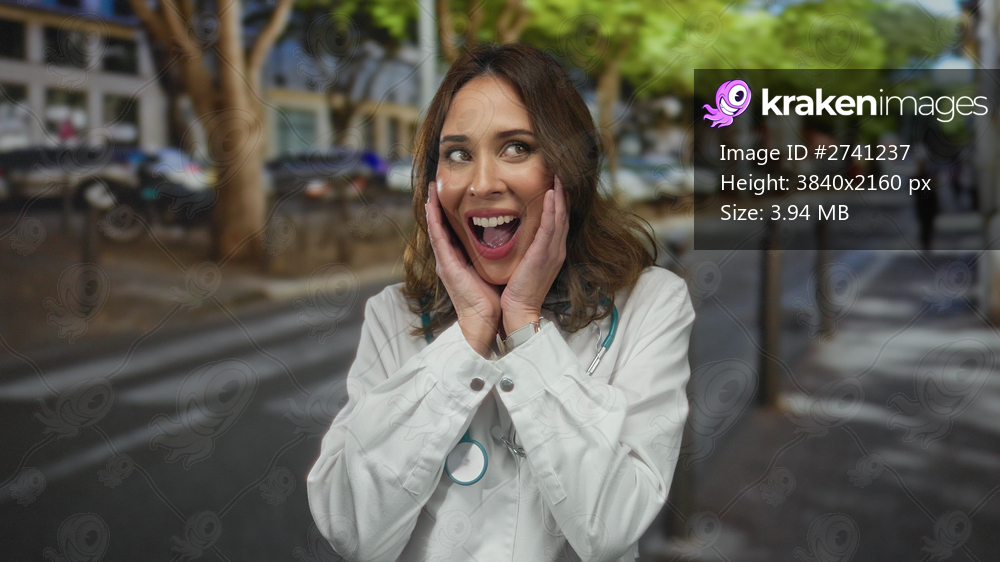 Young woman doctor smiles warmly covering mouth, holding stethoscope, standing on a bustling city street, surrounded by urban greenery, conveying a joyful outdoor scene. - Kraken Images