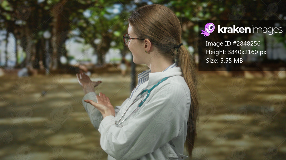 Young woman doctor smiles while raising stethoscope in bright green forest; wellness compassion serenity.