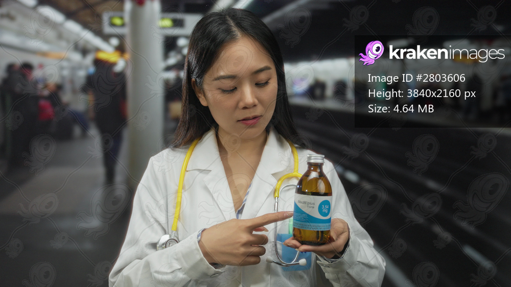 Young woman doctor with stethoscope examines bottle in a bustling train station, highlighting medical professionalism in public urban setting with diverse commuters. - Kraken Images