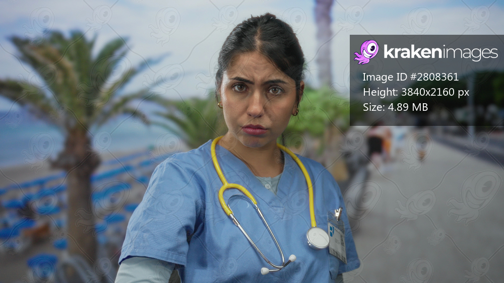 Young woman doctor with stethoscope points finger and beckons along seaside street promenade; urgent care.