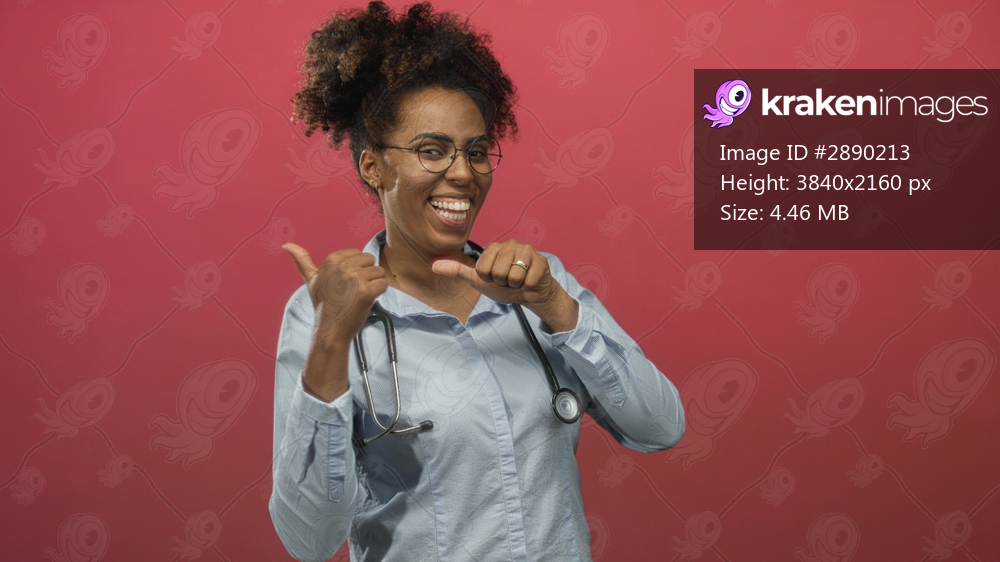 Young woman doctor wearing glasses and stethoscope in light blue shirt smiling and giving thumbs up in pink studio; confidence care.