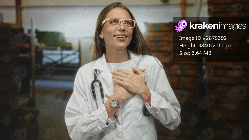 Young woman doctor wearing labcoat and stethoscope places hands over her chest in a building, eyes closed and smiling softly; gratitude.