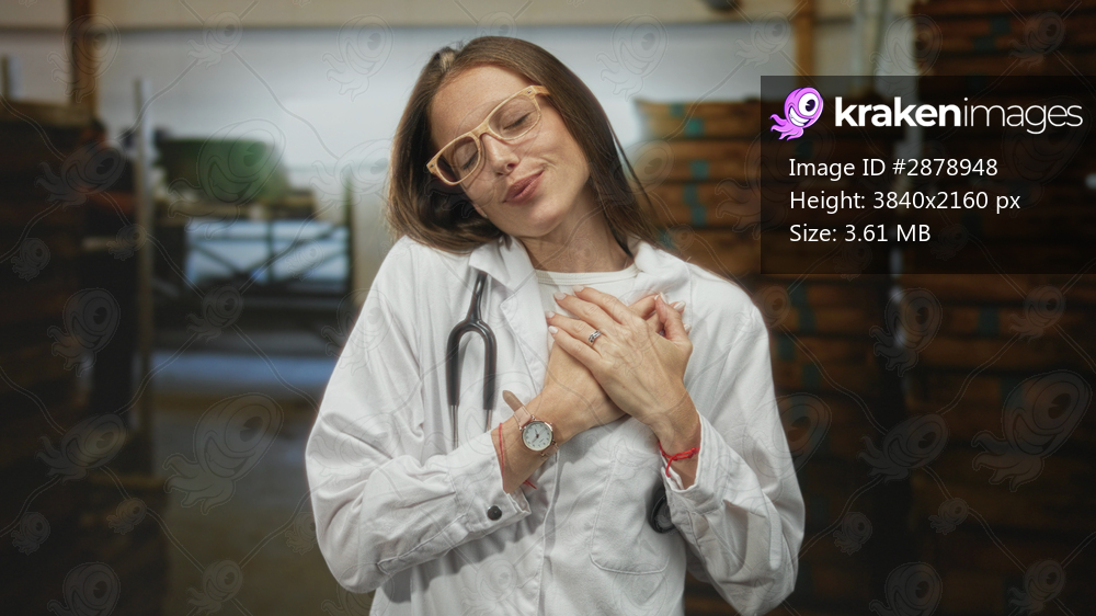 Young woman doctor wearing labcoat and stethoscope places hands over her chest in a building, eyes closed and smiling softly; gratitude.