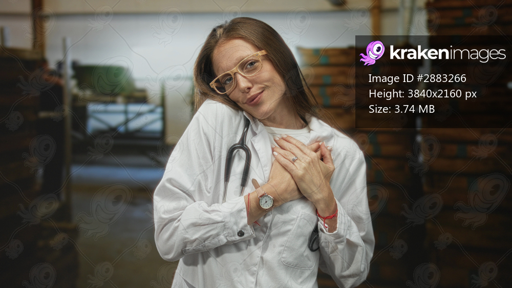 Young woman doctor wearing labcoat and stethoscope places hands over her chest in a building, eyes closed and smiling softly; gratitude.