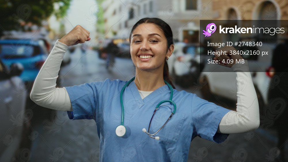 Young woman doctor wearing scrubs flexes confidently with a stethoscope on a busy urban street, showcasing strength and positivity in the healthcare profession. - Kraken Images