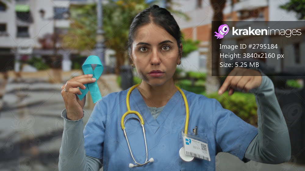 Young woman doctor wearing stethoscope holds blue ribbon and points finger down on street; compassionate support.