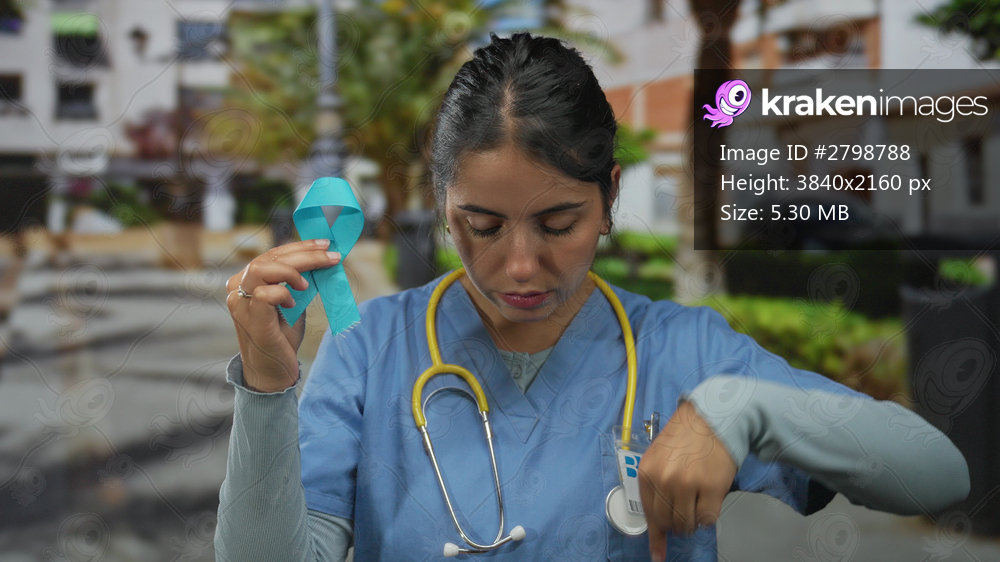 Young woman doctor wearing stethoscope holds blue ribbon and points finger down on street; compassionate support.