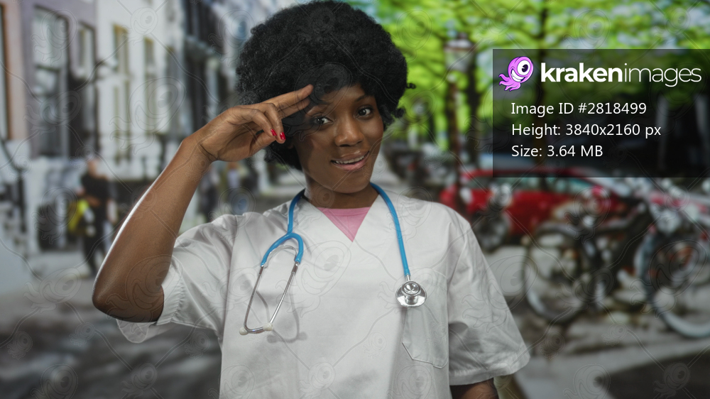 Young woman doctor wearing stethoscope and white scrubs salutes on bustling city street; pride duty.