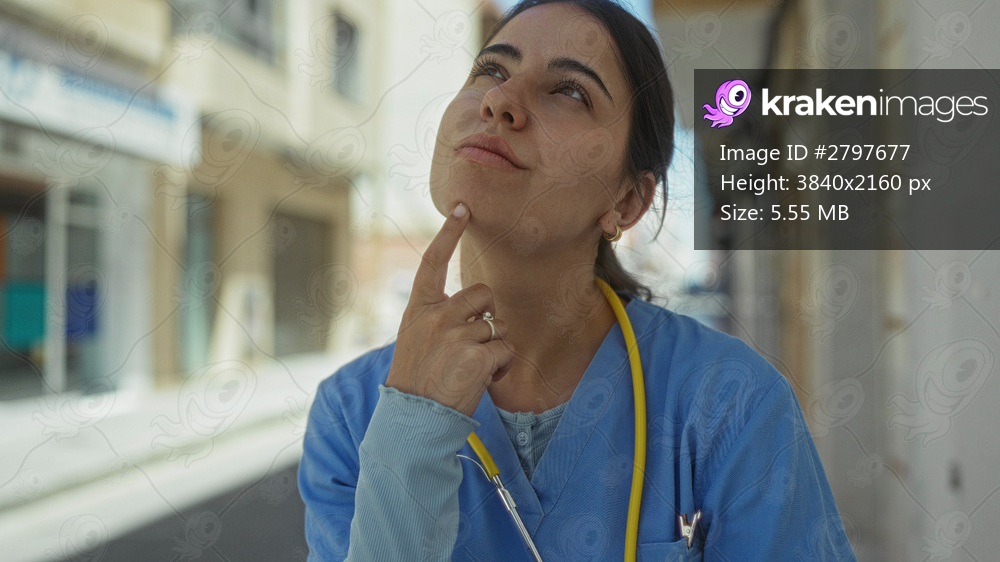 Young woman doctor wearing uniform and stethoscope thinking on a street outdoors during a sunny day